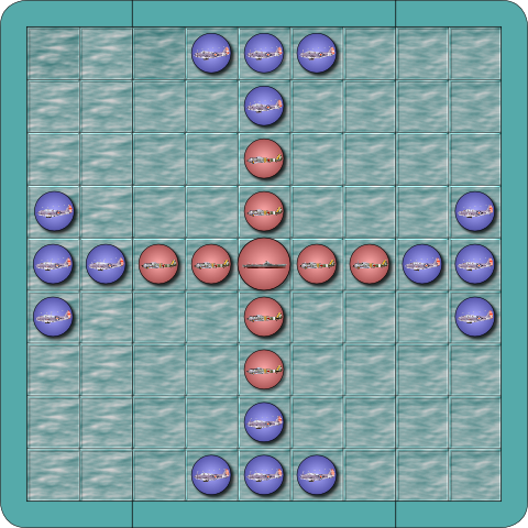 It is 1943. A Japanese aircraft carrier has become detached from its fleet, and is steaming to catch up. Suddenly, out of the clouds, a squadron of U.S. bombers appears! This is a setting for the game of sea battle tafl. The aircraft carrier must escape from the board with the aid of its eight fighters. The sixteen bombers must sink the carrier by surrounding it on all four sides, so that it cannot escape.