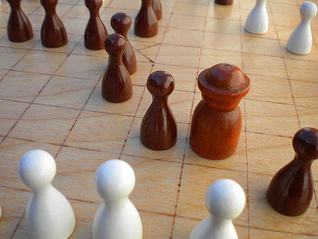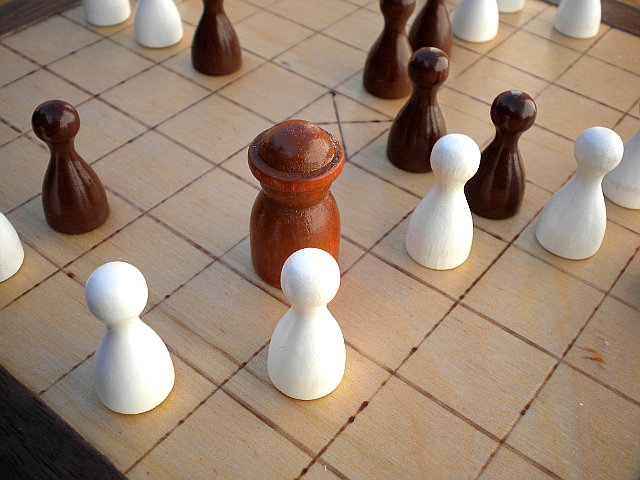 Basic 37-piece Hnefatafl Game in play, close-up.