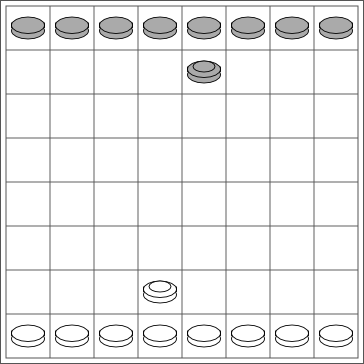 2. Upon the board are set eight soldiers of each colour, black on the back row of the board, and white opposite. On the next row in front of the soldiers, a king is positioned, each player placing the king on the fourth square from his left.
