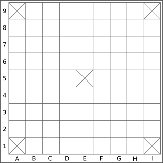 As the board has rotational symmetry, those recording a game must decide from what direction they will view the board. Once done, the files are lettered starting with A on the left, not omitting letters I nor O for games that are large enough. Upper or lower case letters may be used at discretion. The ranks are numbered from 1 at the bottom.