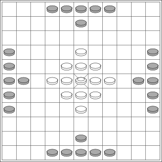 A sixteenth century description gives the size of board and the general distribution of pieces, but the exact layout is open to interpretation. One layout that matches the description has been widely adopted on the eleven-by-eleven square board, with 37 pieces, having the defending forces in a compact diamond and the attackers in T-shapes around the edges.