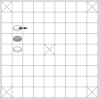 Sometimes this might not be possible or advantageous, though, in which case another solution would be to take advantage of the enemy piece's two open sides: move a third piece to flank the enemy, and then a fourth piece to make the capture. This looks like a four-sided capture, like some games use to capture the king. But really it's just a two-sided capture, where the first two pieces are irrelevant.