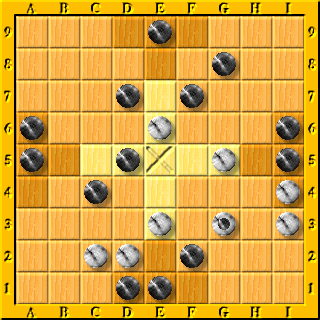 1. E8-G8 C5-C2; 2. H5-H7 D5-D2; 3. A4-C4 F5-F2xE2; 4. B5-D5 E5-F5; 5. I4-I3 E4-I4; 6. D9-D7 F2-I2xI3; 7. F9-F7xE7 F5-F3; 8. H7-H3 I2-I3; 9. F1-F2 F3-G3xH3; 10. (resigned).