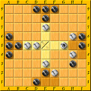 1. F1-F4 G5-G4xF4 2. E1-F1 G4-H4 3. F1-F3 E6-H6xH5 4. F3-H3 F5-F2 5. I5-H5xH4 E4-H4xH5 6. I4-I5 E5-G5++